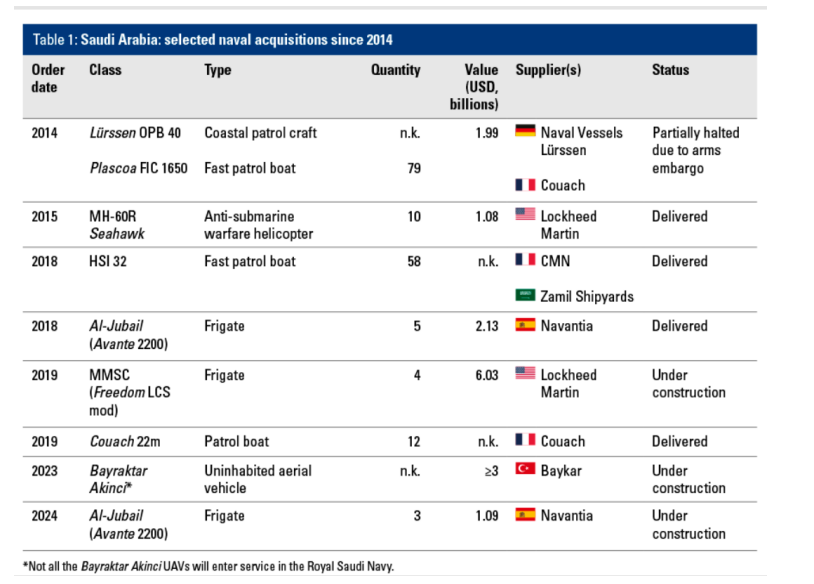 Uluslararası Stratejik Araştırmalar Enstitüsü (IISS) tarafından yayınlanan Albert Vidal Ribe imzalı makalede, Suudi Arabistan’ın özellikle deniz gücünü kendi imkanları ile üretmek üzere tersane kurulumuna ve teknoloji transferine aciliyet verdiği belirtiliyor.