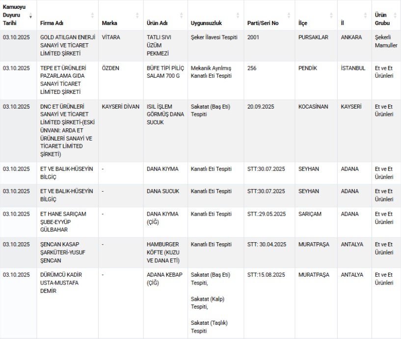 Tarım ve Orman Bakanlığı, 3 Ekim 2025 tarihinde yeni taklit veya tağşiş yapılan gıdalar listesini açıkladı. Aralarında et ürünleri, zeytinyağı, bal ve pekmezin de bulunduğu birçok gıda ürününde hile tespit edildi.