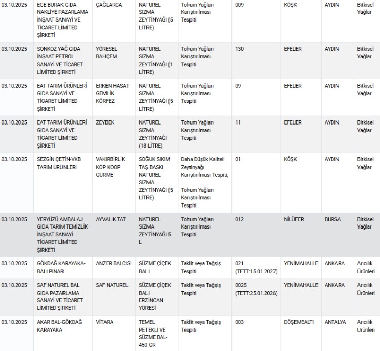 Bakanlık tarafından açıklanan listede zeytinyağları da öne çıktı. Aydın, Bursa ve çevresindeki bazı markaların "natürel sızma zeytinyağı" adı altında piyasaya sürdüğü ürünlerde tohum yağlarıyla karıştırma yapıldığı tespit edildi. Ayrıca bazı ürünlerde daha düşük kaliteli yağların kullanıldığı da belirlendi.