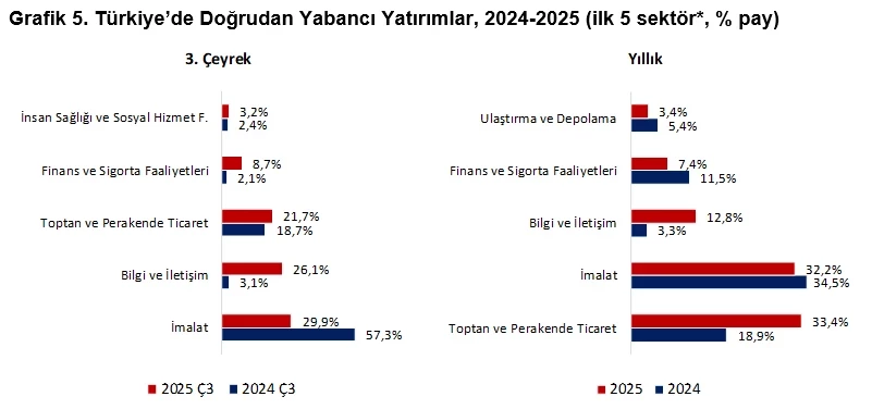 2025 üçüncü çeyrekte Türkiye'ye yapılan yabancı yatırımlarda imalat sektörü yüzde 29,9'luk payı ile ilk sırada yer aldı. İmalatı yüzde 26,1'lik payı ile bilgi-iletişim sektörü izledi.
