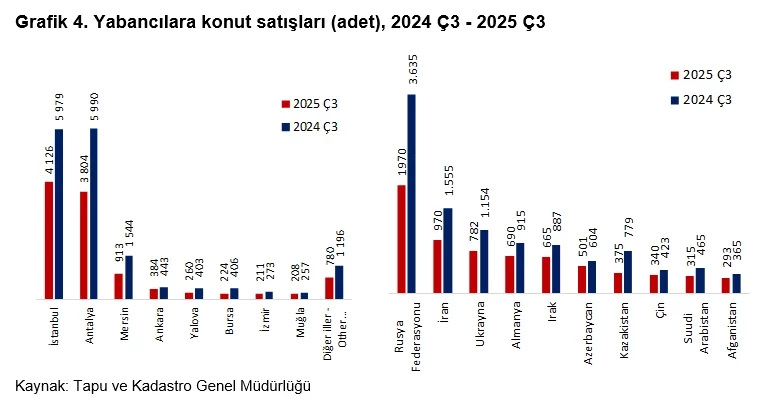 Bültene göre 2025 yılı üçüncü çeyreğinde yabancılara yapılan konut satışı yüzde 42,4 azaldı ve 10 bin 710'a geriledi.