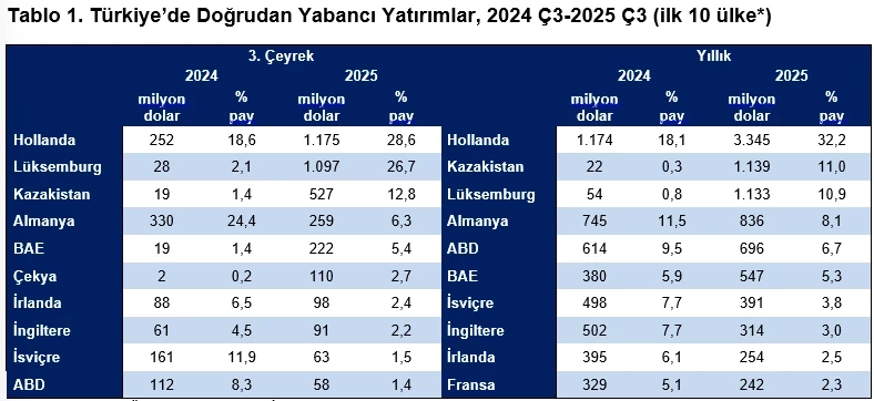 Bültende paylaşılan bilgilere göre 2025 yılı üçüncü çeyreğinde Türkiye’ye yapılan doğrudan yabancı yatırımların yüzde 28,6’sı Hollanda tarafından yapıldı.