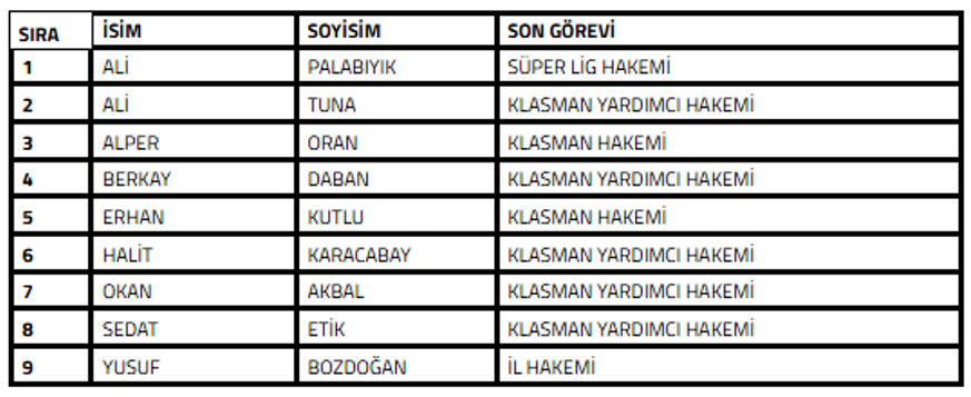 Listede Süper Lig hakemi Ali Palabıyık da yer aldı. Diğer isimler ise şöyle: Ali Tuna, Alper Oran, Berkay Daban, Erhan Kutlu, Halit Karacabay, Okan Akbal, Sedat Etik, Yusuf Bozdoğan.
