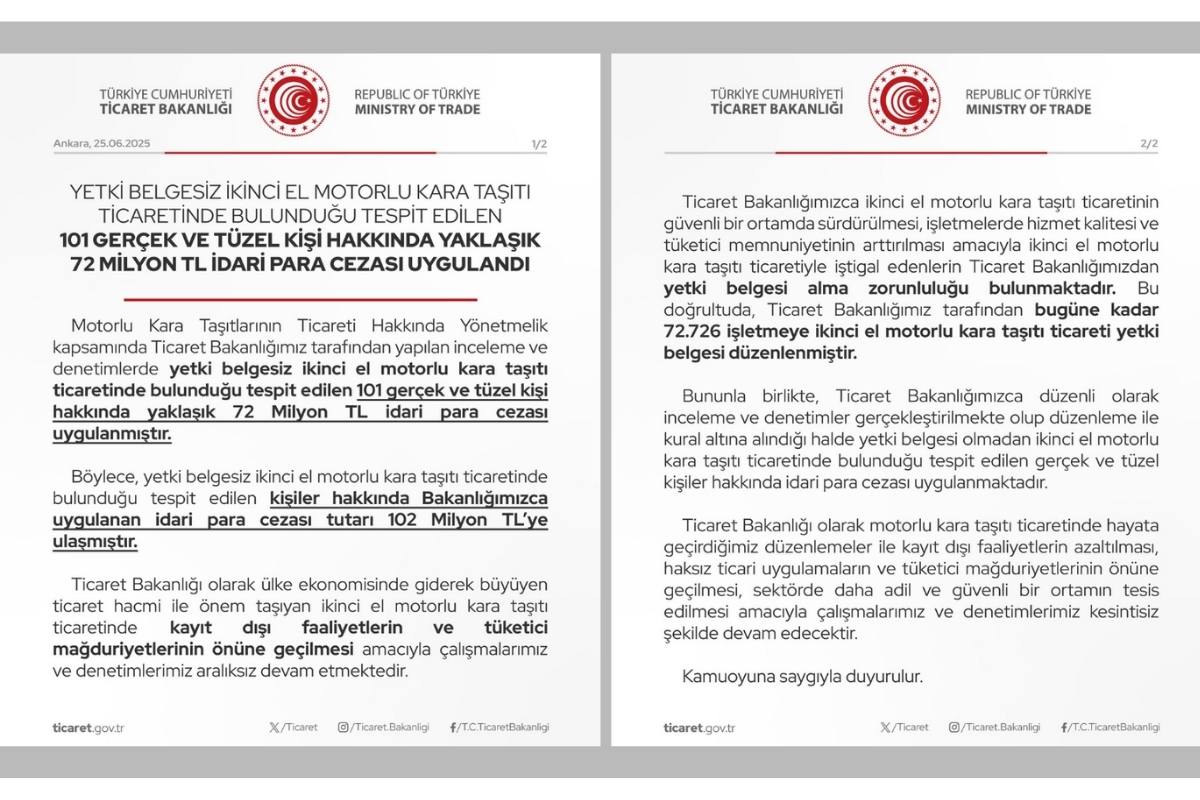 Ticaret Bakanlığı, ikinci el motorlu kara taşıtı ticaretinde yetki belgesi olmadan faaliyet gösteren 101 gerçek ve tüzel kişiye yaklaşık 72 milyon TL tutarında idari para cezası uygulandığını duyurdu.