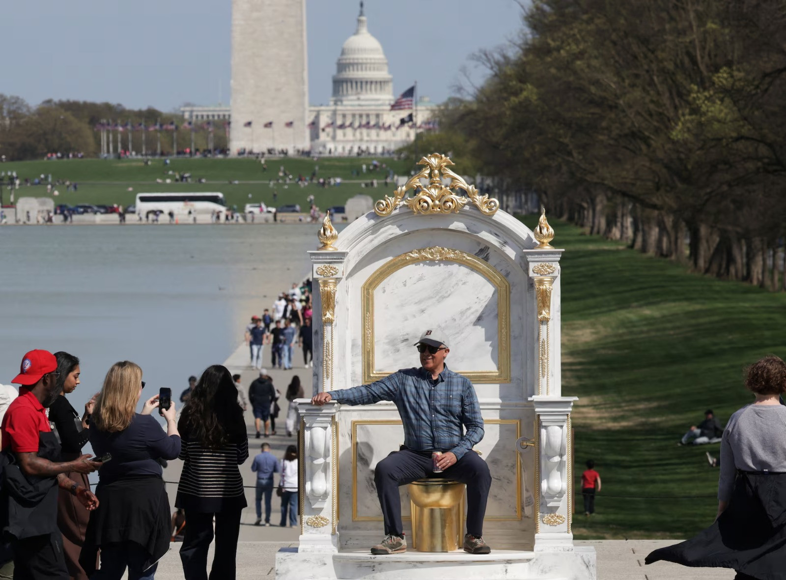 ABD Başkanı Donald Trump'ın Beyaz Saray'da yaptığı tadilatlara yönelik bir eleştiri olarak, Washington'daki Ulusal Anıt Alanı'na altın bir tuvaleti olan büyük bir taht yerleştirildiğini okurken gülümsüyorum...