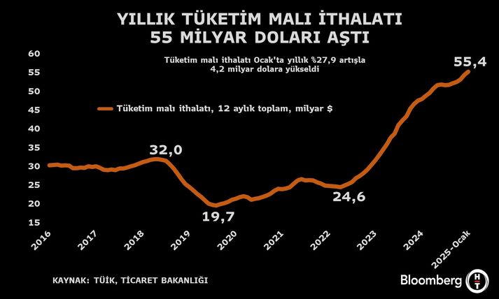 Yıllıklandırılmış olarak bakıldığında tüketim malı ithalatı Ocak itibariyle 55,4 milyar dolarla yeni zirvesini gördü.