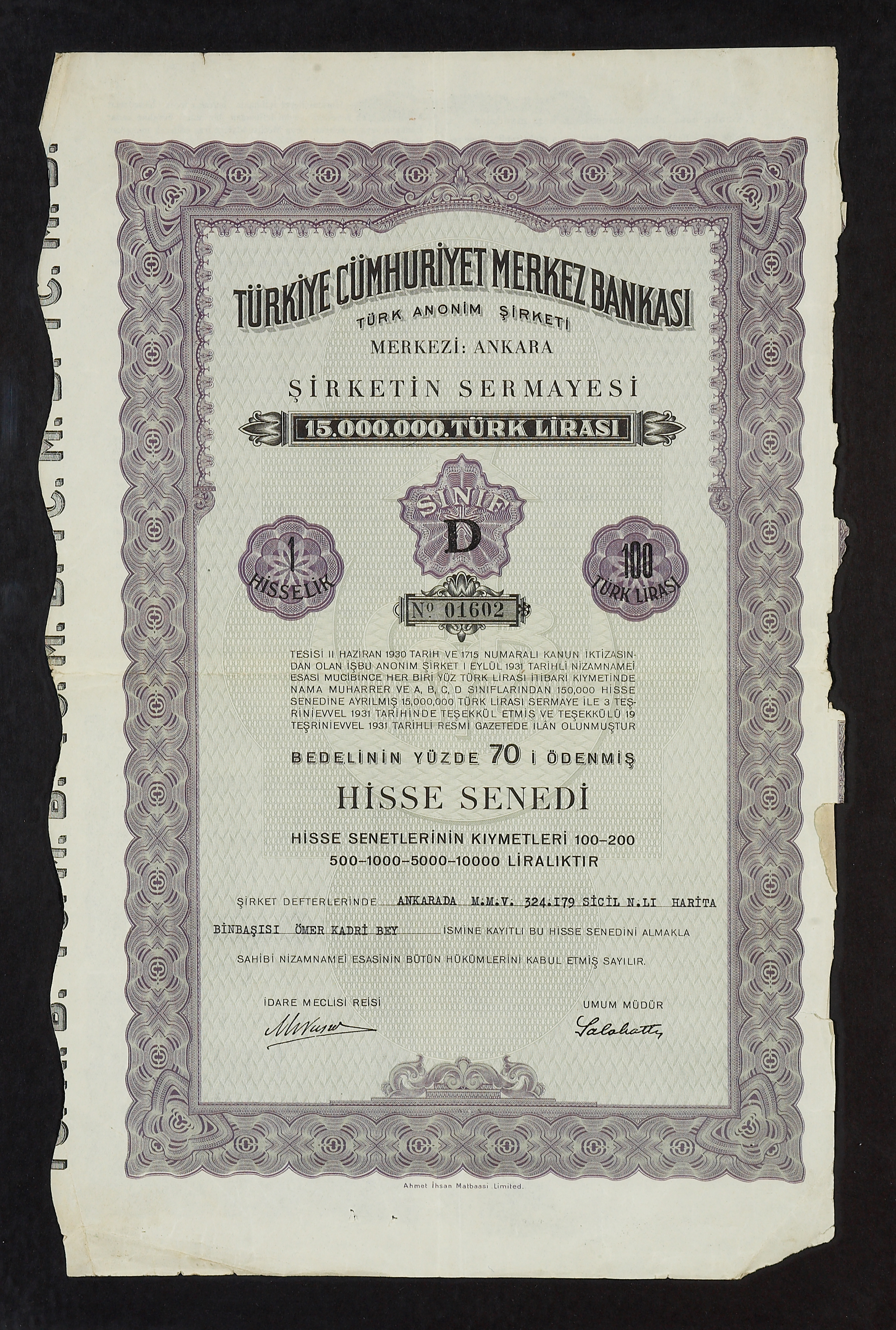 1211 sayılı Merkez Bankası Kanunu uyarınca, Merkez Bankası hisse senetleri (A), (B), (C) ve (D) olmak üzere 4 sınıfa ayrılmış olup (A) sınıfı hisse senetleri münhasıran Hazine'ye, (B) sınıfı hisse senetleri Türkiye'de faaliyette bulunan milli bankalara, (C) sınıfı hisse senetleri 15 bin hisseyi geçmemek üzere milli bankalar dışında kalan diğer bankalarla imtiyazlı şirketlere, (D) sınıfı hisse senetleri ise Türk ticaret müesseselerine ve Türk vatandaşlığını haiz tüzel ve gerçek kişilere tahsis edildi.