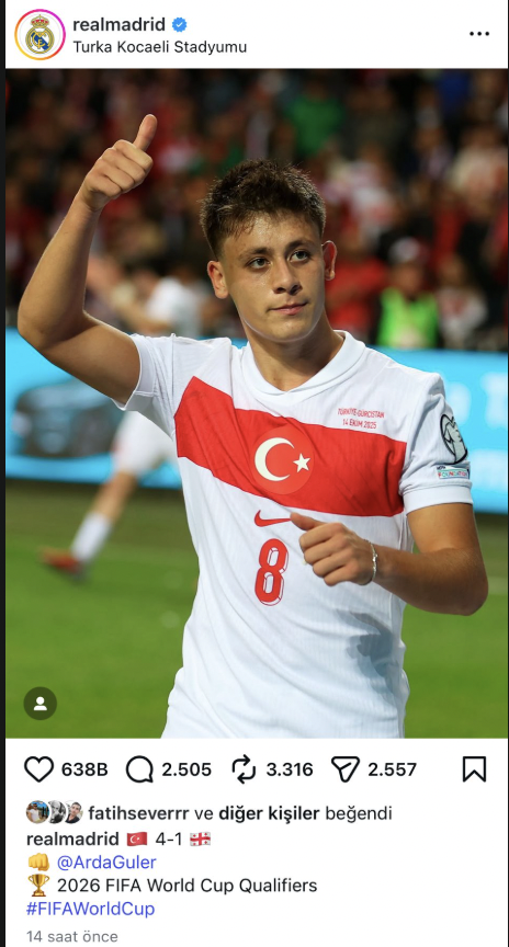 178 milyon takipçili Instagram hesabında oyuncusunu tebrik eden Real Madrid, milli yıldızı Arda Güler’in fotoğrafını paylaşarak konum olarak da Turka Araç Muayene Kocaeli Stadyumu’nu etiketledi.