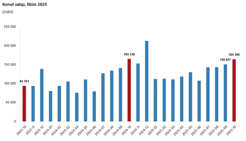 Türkiye İstatistik Kurumu (TÜİK), Konut Satış İstatistikleri Ekim 2025 verilerini açıkladı. Türkiye genelinde ekim ayında 164 bin 306 konut satıldı