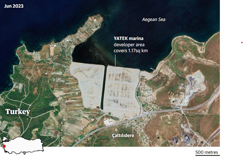 Ege kıyısında İzmir’deki Çaltılıdere sulak alanı, lüks yatların bakımı ve marinanın inşası için beton temeller altında kaldı; flamingolar, pelikanlar ve çipura gibi türlerin yaşam alanları yok oldu.