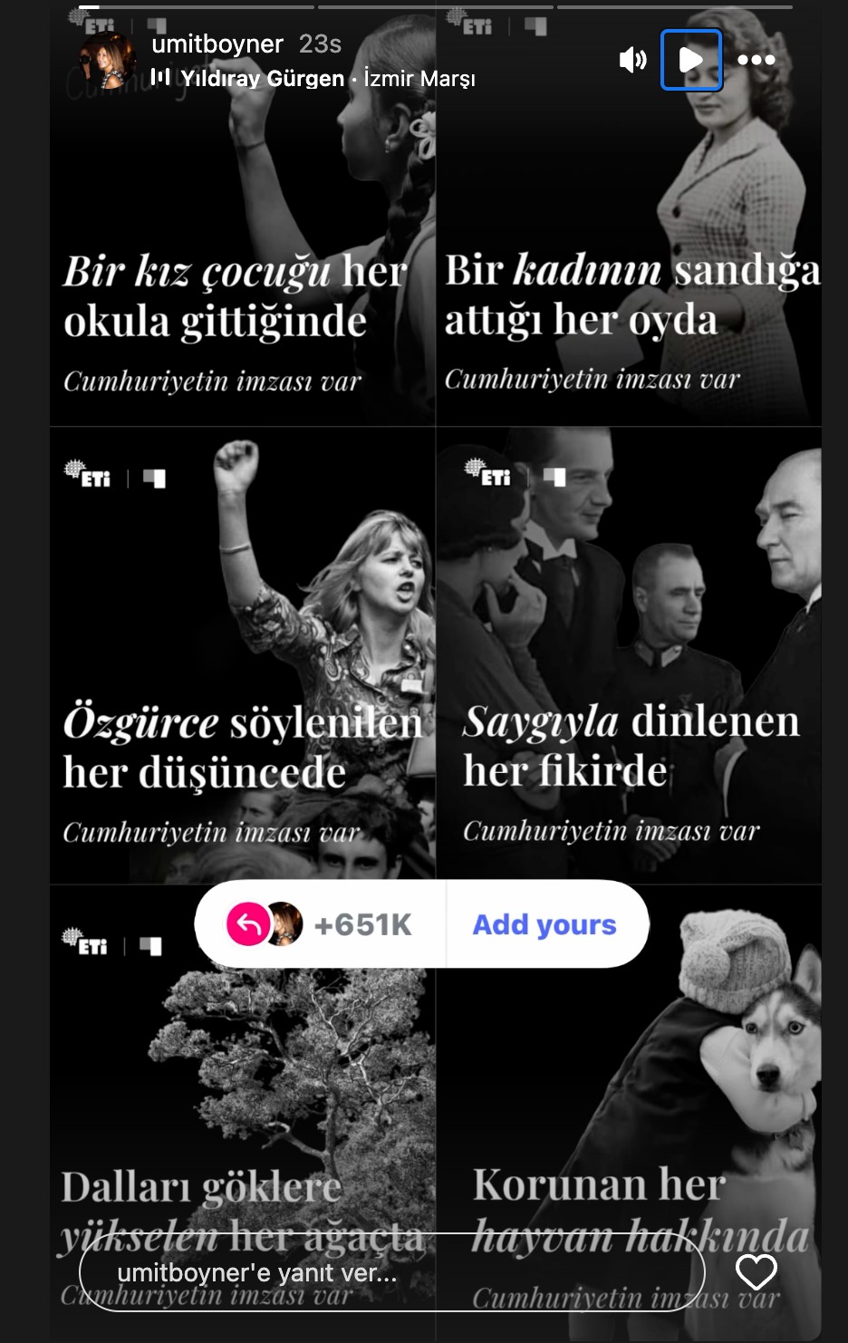 Boyner Holding Yönetim Kurulu Üyesi Ümit Boyner, “Bir kız çocuğu her okula gittiğinde, bir kadının sandığa attığı her oyda, özgürce söylenen her düşüncede, saygıyla dinlenen her fikirde, dalları göklere yükselen her ağaçta, korunan her hayvan hakkında Cumhuriyetin izi var” paylaşımında bulundu.