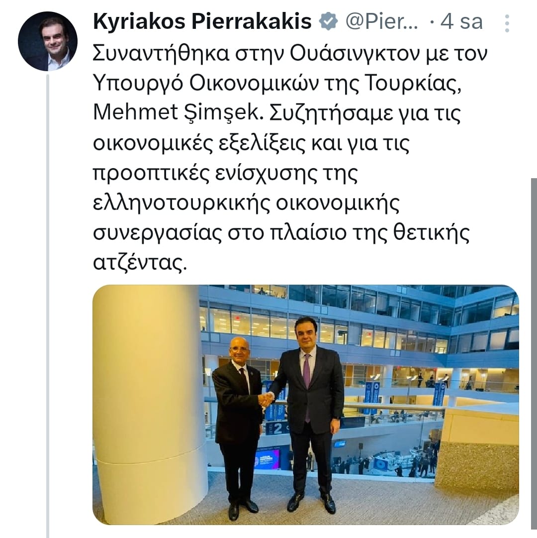 Yunanistan Ekonomi ve Maliye Bakanı Kiriakos Pierrakakis sosyal medya hesabından yaptığı açıklamada Washington'da Türkiye Maliye Bakanı Mehmet Şimşek ile bir araya geldiğini duyurdu.