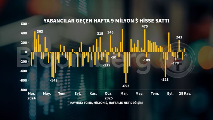 Türkiye Cumhuriyet Merkez Bankası (TCMB) verilerine göre 28 Kasım haftasında yurt dışı yerleşiklerin hissede 9,2 milyon dolarlık satış yaptığı görüldü.