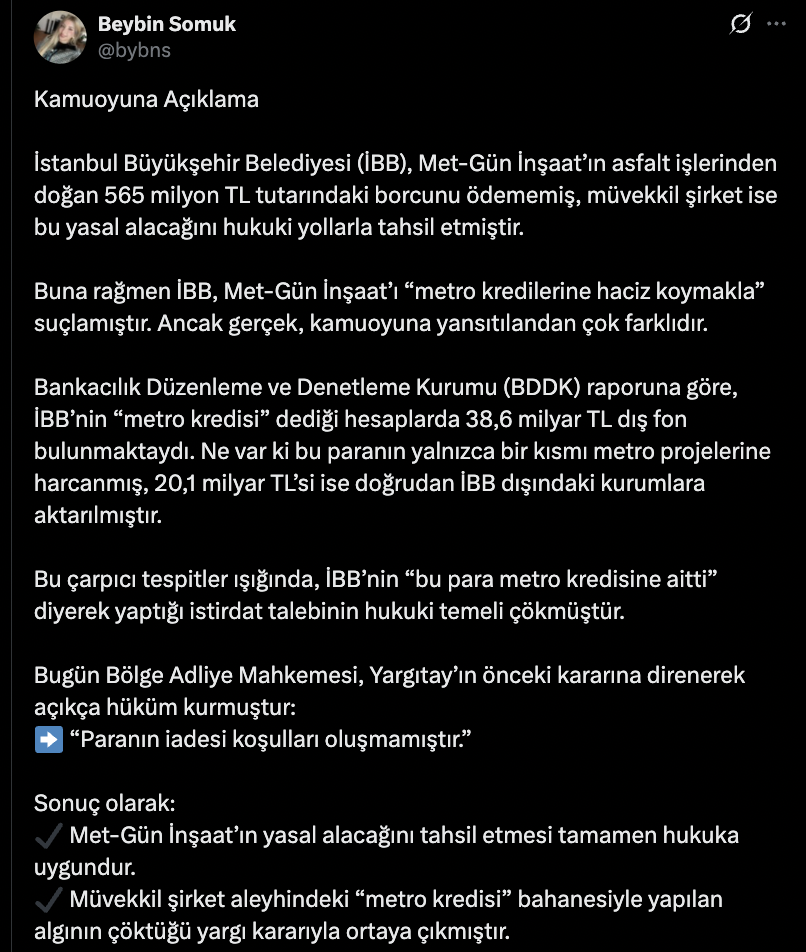 Avukat Somuk’un paylaşımlarına göre, Ekrem İmamoğlu döneminde İBB, Met-Gün İnşaat’ın asfalt işlerinden doğan 565 milyon TL’lik borcunu ödememiş, şirket ise bu alacağını yasal yollarla tahsil etmiş.