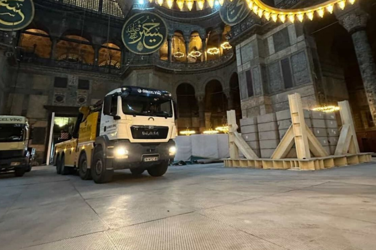 "Tüm bu çalışmaların sahada güvenli ve hızlı biçimde yürütülebilmesi amacıyla, doğu yönünde kurulmak üzere 41 metre yüksekliğinde ve 60 metre bom uzunluğunda kule vinç projelendirildi. Bu vinç, yapıya uygun mesafede ve güvenli dönüş alanı sağlayacak şekilde planlandı. Ana kubbe güçlendirmesi, kurşun değişimleri, mozaik konservasyonu ve cephe ile minare onarımları tamamlandıktan sonra geçici olarak kurulan çelik konstrüksiyon örtü, platform ve kule vinç, kuruldukları yöntemle sökülecek. Böylece Ayasofya-i Kebir Cami-i Şerifi'nin tarihi kubbesi, kapsamlı bir güçlendirme sürecinin ardından özgün haliyle korunarak gelecek kuşaklara aktarılmış olacak."