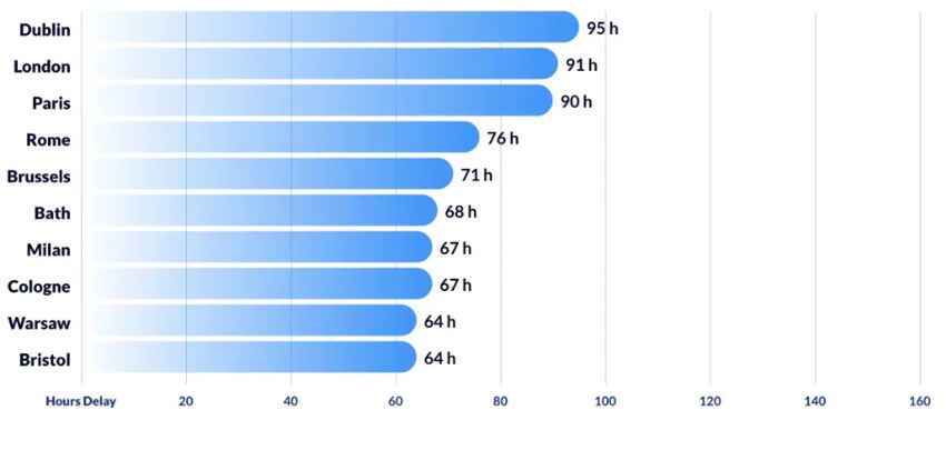 Avrupa’da en yoğun trafik ise 95 saatlik kayıpla Dublin’de yaşanıyor. Dublin’in ardından Londra (91 saat) ve Paris (90 saat) geliyor.